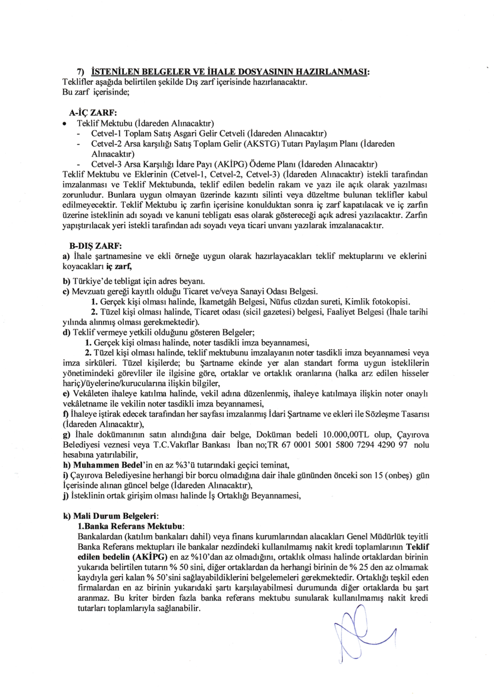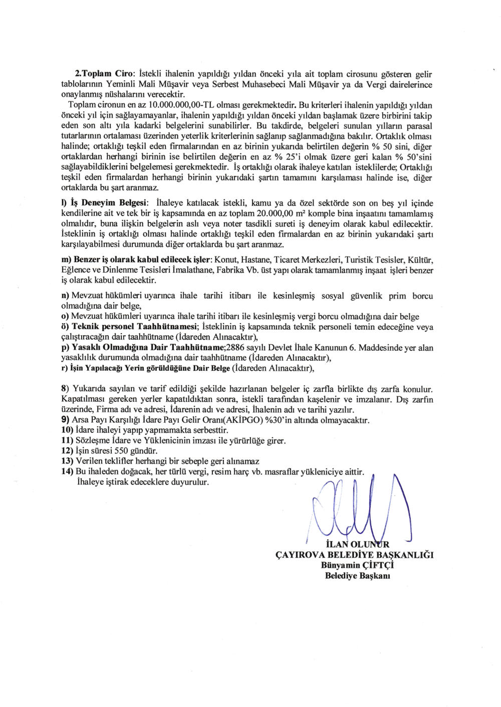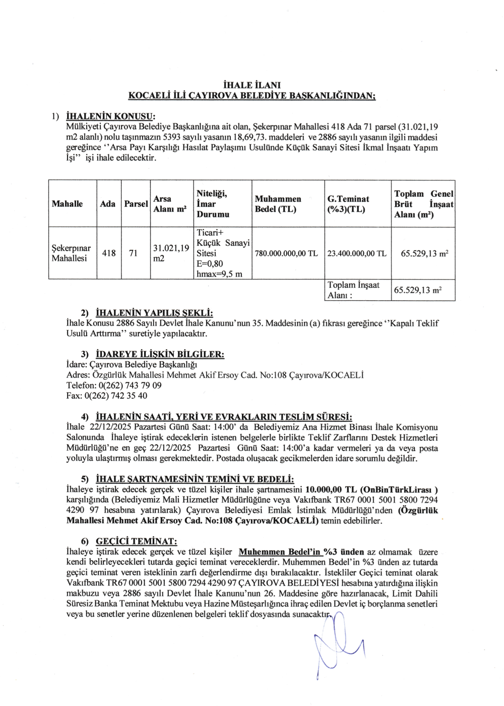 Mülkiyeti Çayırova Belediyesine ait olan, Şekerpınar Mahallesi 418 Ada 71 Parsel nolu taşınmazın 5393 Sayılı Belediye Kanunu'nun 18, 69 ve 73. Maddeleri ve 2886 sayılı yasanın ilgili maddesi gereğince ''Arsa Payı Karşılığı Hasılat Paylaşımı Usulünde Küçük Sanayi Sitesi İkmal İnşaatı Yapım İşi'', 2886 sayılı Devlet İhale Kanununun 35/a. maddesi “Kapalı Teklif Usulü” ile ihale edilmesi hakkında...