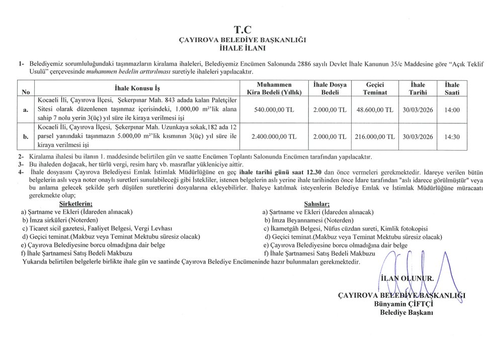 Kiralama İhale İlanı hk. (843 Ada 7 nolu parsel ve 182/12 parsel yanı)