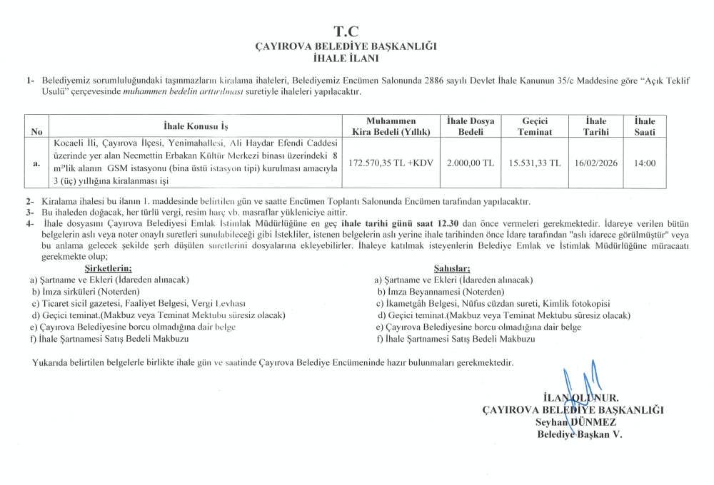 Kiralama İhale İlanı hk. (N.Erbakan Kültür Merk. binası GSM istasyonu)