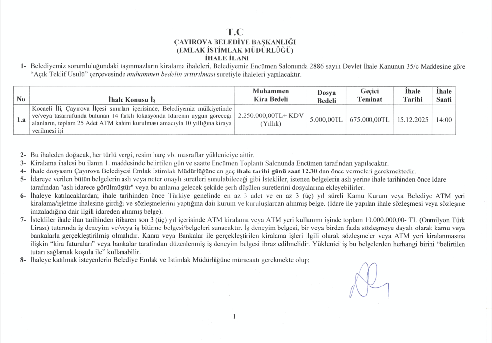 Kiralama İhale İlanı hk.(ATM Kabini Kurulumu)