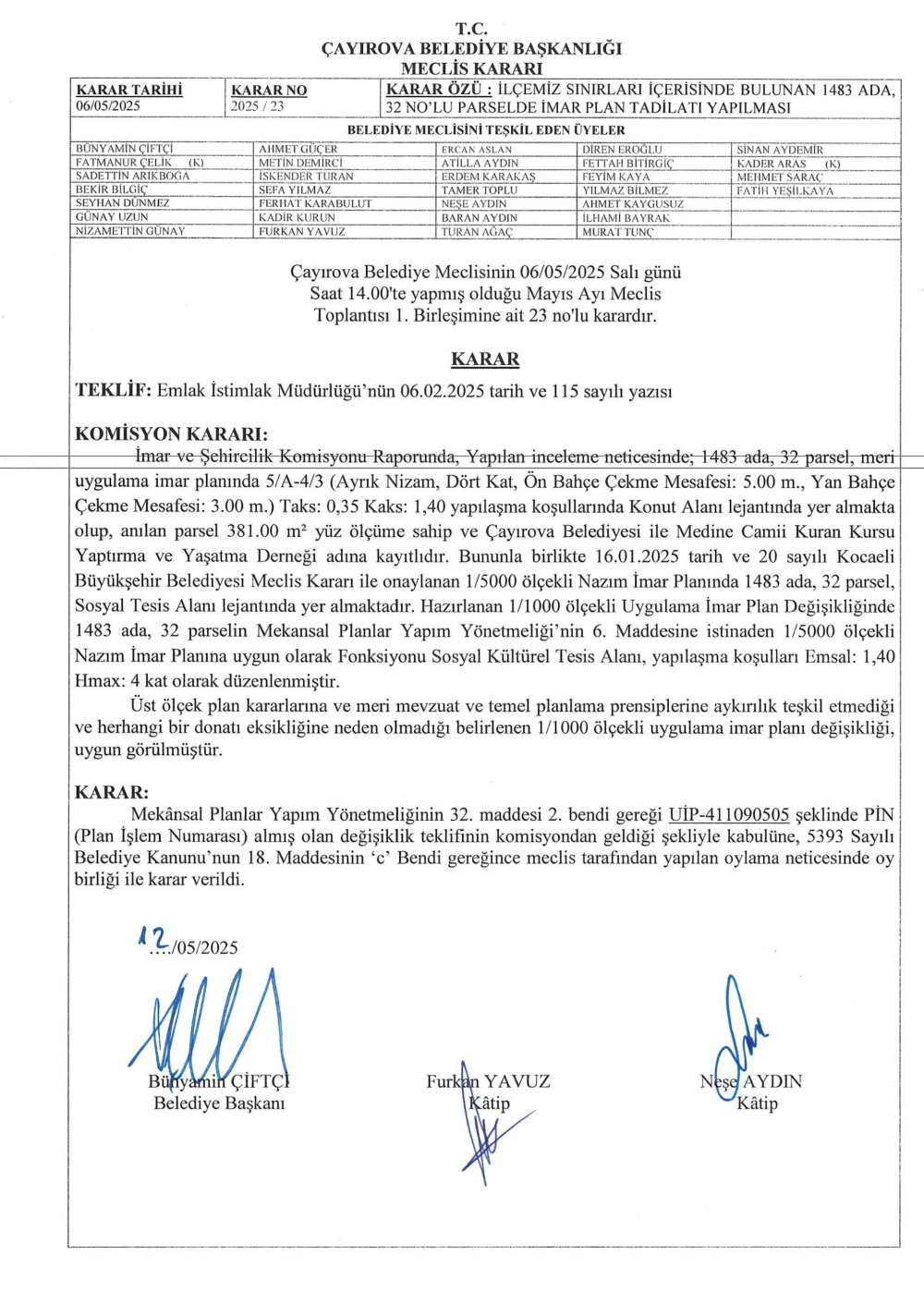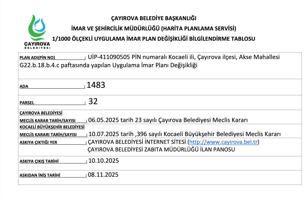 İlçemiz Akse Mahalleleri sınırları içerisinde, G22.b.18.b.4.c uygulama imar planı paftasında kalan 1483 ada 32 parsele ilişkin hazırlanan UİP-411090505 PİN no'lu 1/1000 ölçekli Uygulama İmar Planı değişikliği teklifi Kocaeli Büyükşehir Belediye Meclisi'nin 10.07.2025 tarih ve 396 sayılı kararı ile uygun görülmüştür. 1/1000 ölçekli Uygulama İmar Planı Değişikliğine ait bir adet meclis kararı, bir kopya uygulama imar plan değişikliği paftalarının;